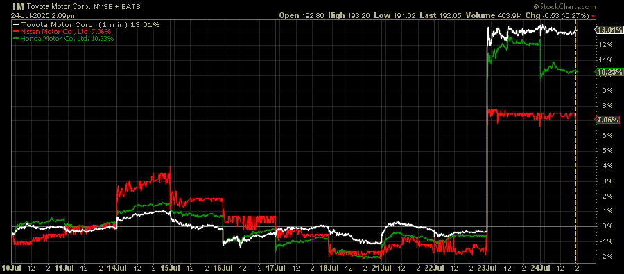 Trump has threatened to impose a 25% tariff on all auto imports. This deal reduces the tariff on Japanese auto imports to just 15%. It doesn’t entirely remove Japan’s disadvantage in the U.S. market, but it’s a relief that it won’t be more. Plus, the certainty around the number also helps calm nerves.