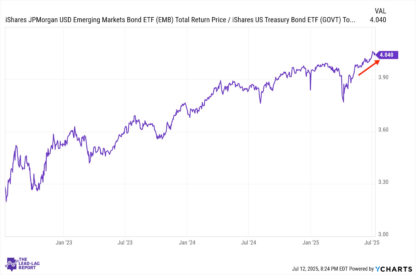 There has been a slight uptrend developing in inflation protection, but it’s a minor one. It would be easy to say that escalating tariff risk would be the primary catalyst, but given the equity market’s relatively muted reaction, that might not be the case. I mostly see inflation expectations being largely settled here and any changes in this ratio being largely attributed to normal market fluctuations.