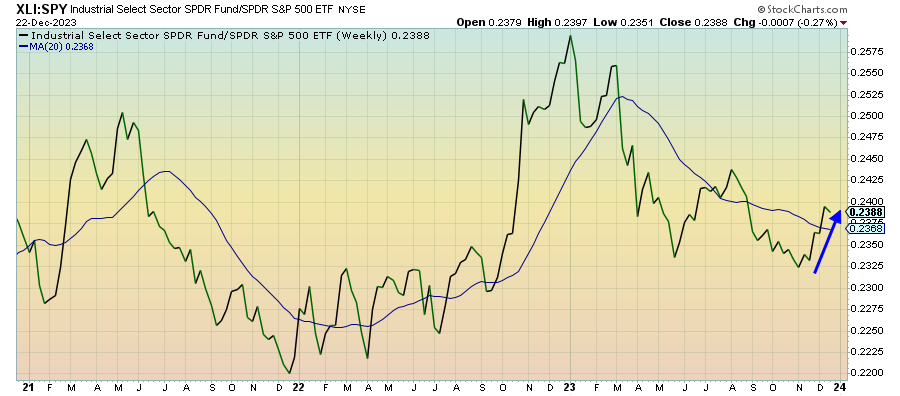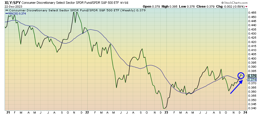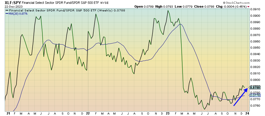 Depressed yields continue to support banks and financials. The ceiling for yields would seem to be in place for a little while, supported by the market’s expectation for aggressive central bank rate cuts in 2024 and the potential return of the flight to safety trade. That could make banks a good pick for the first part of the year, but the growing credit contraction could prove to be a fatal headwind eventually.