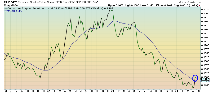 For now, the big spike we saw in this ratio earlier has turned out to be a one-hit wonder. I do, however, think that the macro case for this sector actually improved last week. Anytime inflation starts to trend higher, growth slows and the currency market grows stable (especially among the biggest currencies in the world), investors are likely to eventually begin migrating to safer havens. In the equity market, that’s this sector although it’s been notoriously stubborn to participate lately.