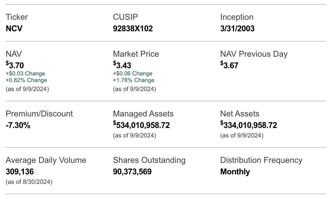 NCV seeks total return through a combination of capital appreciation and high current income. It invests in a diversified portfolio of domestic convertible securities and high yield bonds rated below investment grade. Under normal circumstances, it seeks to invest at least 50% of its total assets in convertible securities, but determines its allocation based on changes in equity prices, changes in interest rates, and other economic and market factors. In searching for investment opportunities, the manager looks for issuers that will successfully adapt to change, exceed minimum credit statistics, and exhibit the most promising operating performance potential. NCV also uses leverage in order to enhance yield and total return potential.