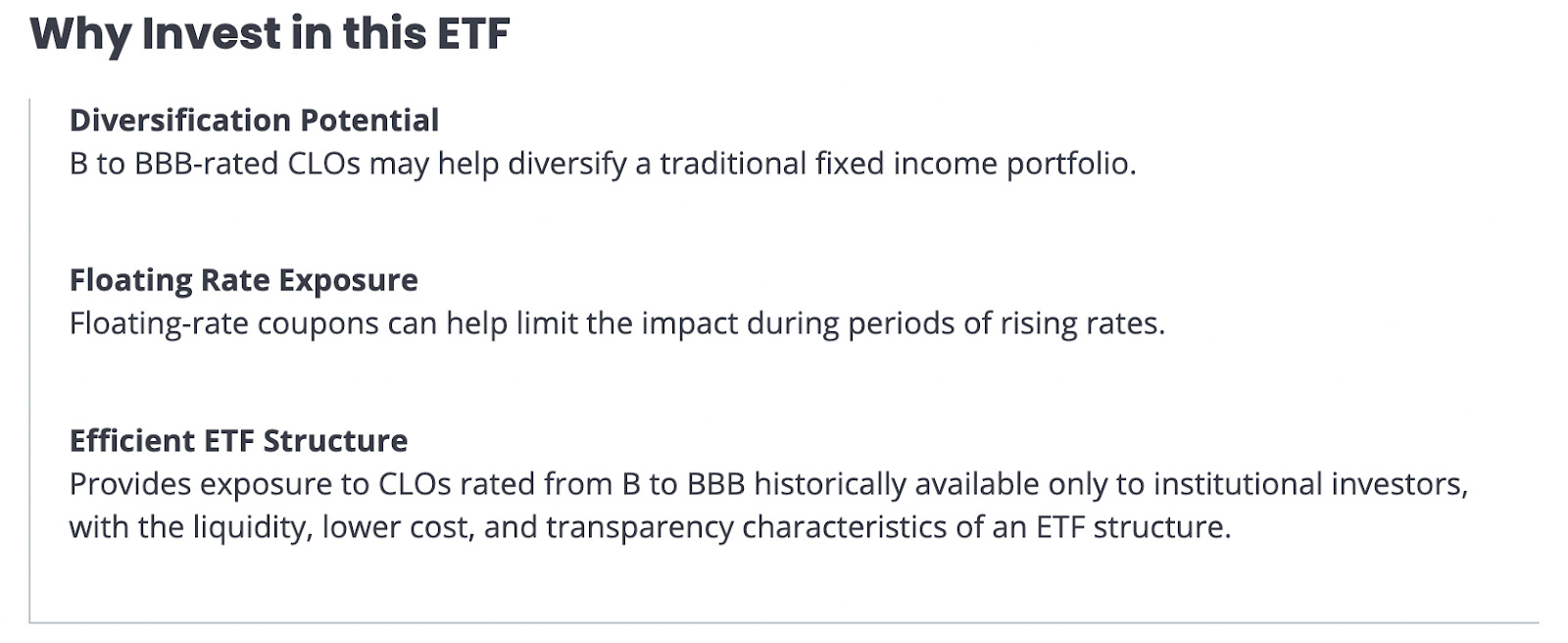 JBBB provides exposure to floating-rate collateralized loan obligations (CLOs) generally rated from B to BBB in a liquid, transparent manner. It seeks to deliver investors access to securities with low default risk, low correlations to traditional fixed income asset classes and high yield potential.