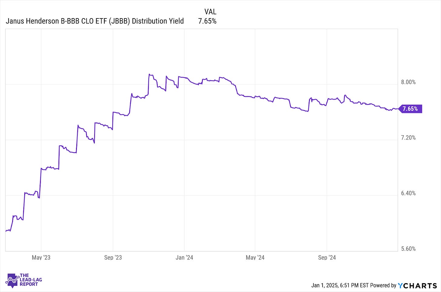 JBBB has been able to hold that 7-8% distribution yield level pretty consistently since its launch. The yield began to slide lower as the market anticipated a series of rate cuts ahead, but I think the annualized yield will begin stabilizing around the 8% mark so long as the Fed keeps rates steady.
