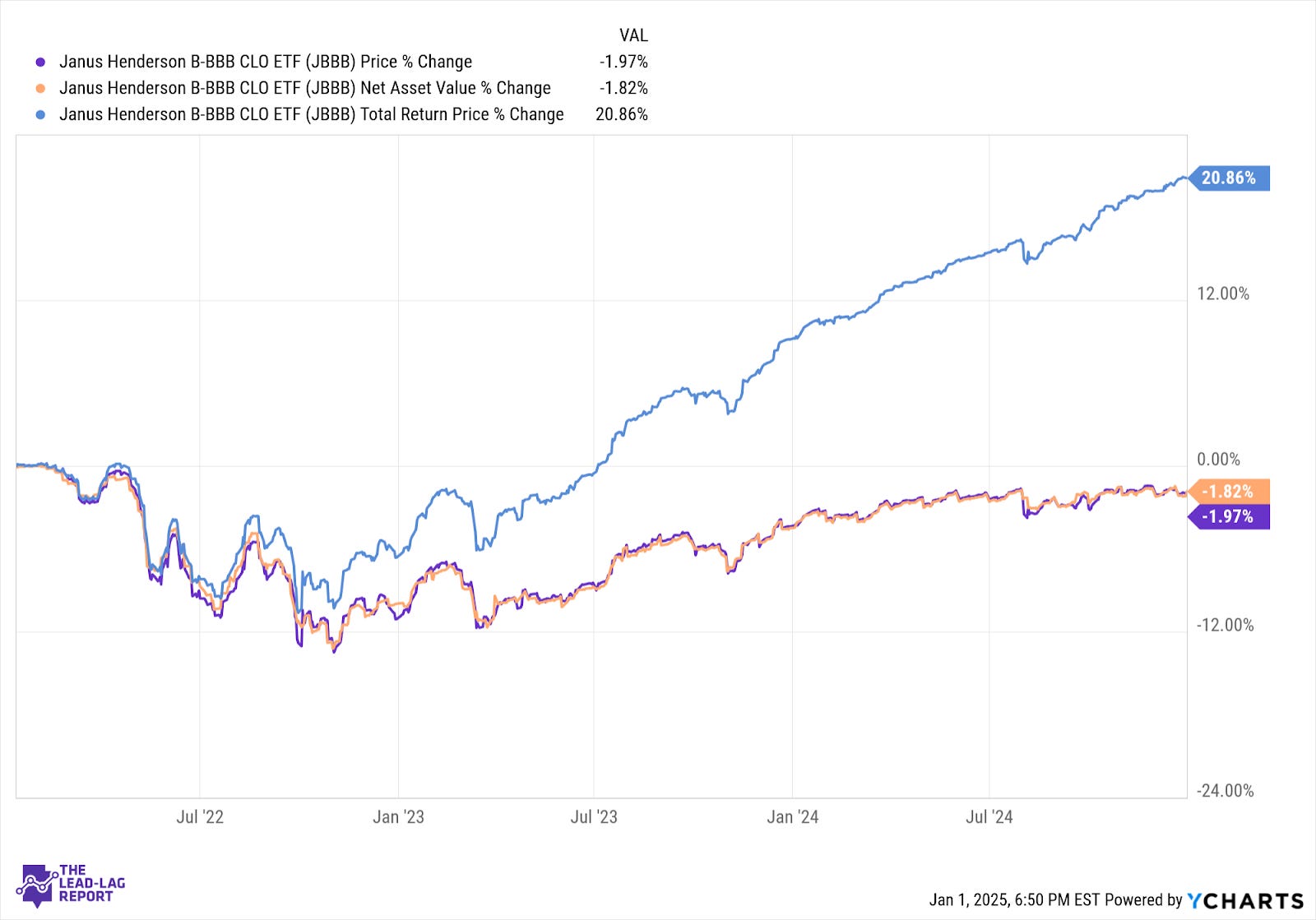 CLOs looked like they could be underperformers during a Fed rate cutting cycle due to the variable rate nature of its holdings. Now that the Fed might hold rates relatively steady throughout 2025, JBBB looks like it has an opportunity to outperform again.