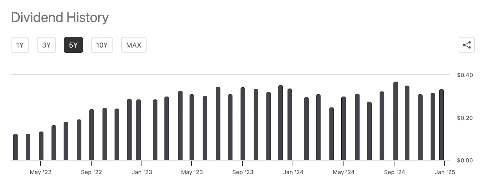 JBBB maintains a flexible monthly distribution policy that pays income as it’s received. Its most recent monthly distribution was $0.0336 per share, which would translate to $0.403 per share annually. At current share prices, that translates to a forward-looking yield of 8.2% (if that distribution level were to be maintained).