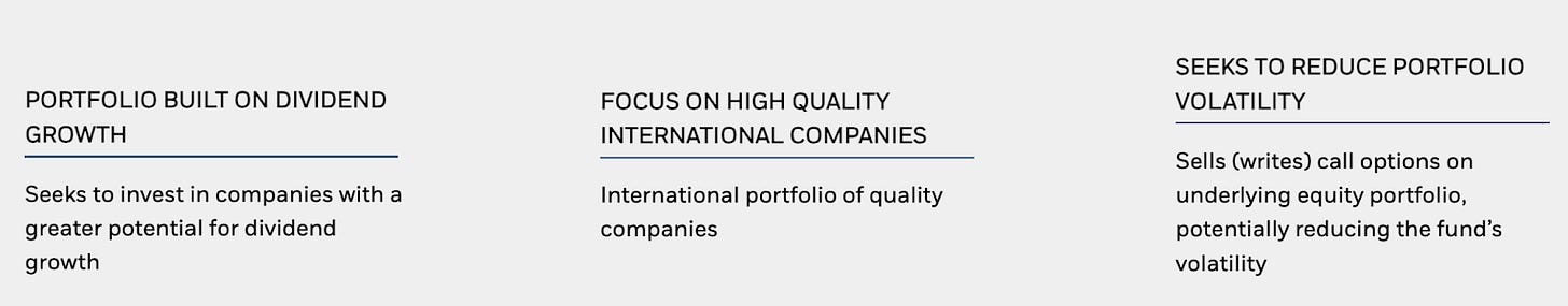 The top 10 holdings include a number of names that investors will be very familiar with. Even though you can get upwards of a 3-4% yield just by investing in a generalized portfolio of international dividend payers, many of the names here don’t come close to paying out that level of income. That’s not really a major consideration since the vast majority of income will be generated by those options. The durable and mature nature of these companies should limit some potential volatility. From a covered call perspective, that limits the income that the options can earn to some degree, but the relative stability might be more important.