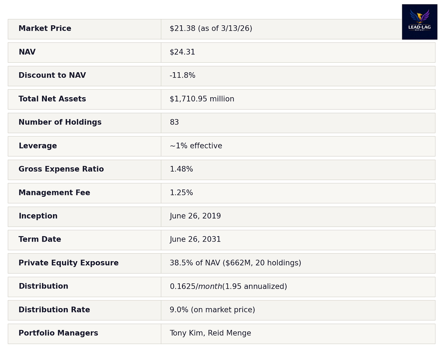 What makes BSTZ truly distinctive isn't just the public tech exposure — NVIDIA at 8.25%, Lumentum at 3.94%, Tower Semiconductor at 2.70% — but the 38.5% private equity allocation. This is $662 million spread across 20 private holdings, with Databricks alone representing 17.4% of net assets. PsiQuantum (quantum computing) at 6.45%, GrubMarket (supply chain AI) at 2.76%, and Anthropic (frontier AI models) at 2.34% round out the top private names. No ETF, no mutual fund, and very few CEFs give retail investors this kind of direct private market access.