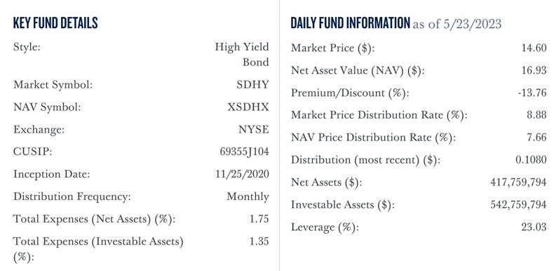 SDHY seeks to provide total return through a combination of current income and capital appreciation by investing primarily in below investment‐grade fixed income instruments. It also seeks to maintain a weighted average portfolio duration of three years or less and a weighted average maturity of five years or less. The fund also utilizes leverage in order to enhance yield and total return potential.