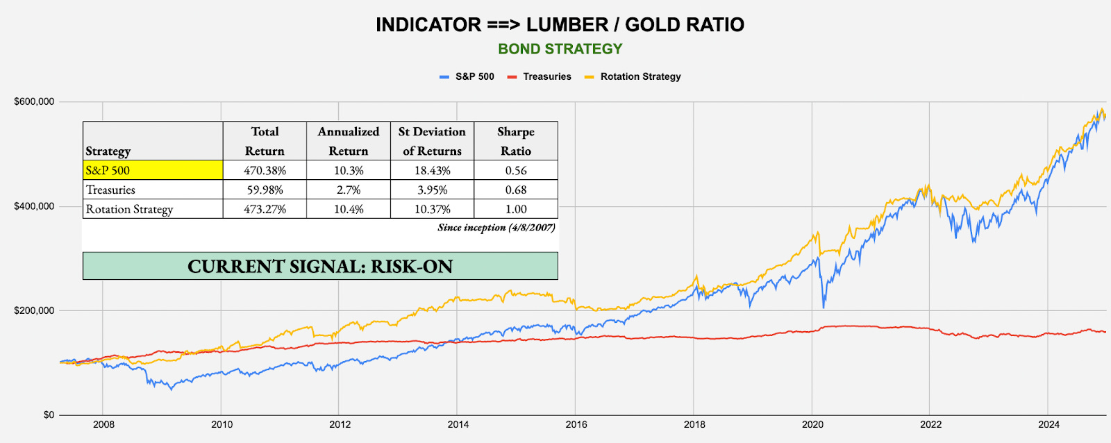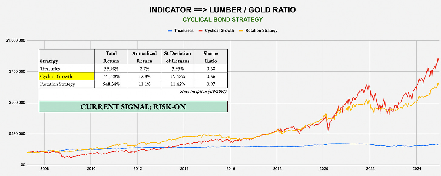 Strategy: Lumber/Gold Cyclical Bond - Example: Invest in Growth (VUG) over Treasuries (GOVT)