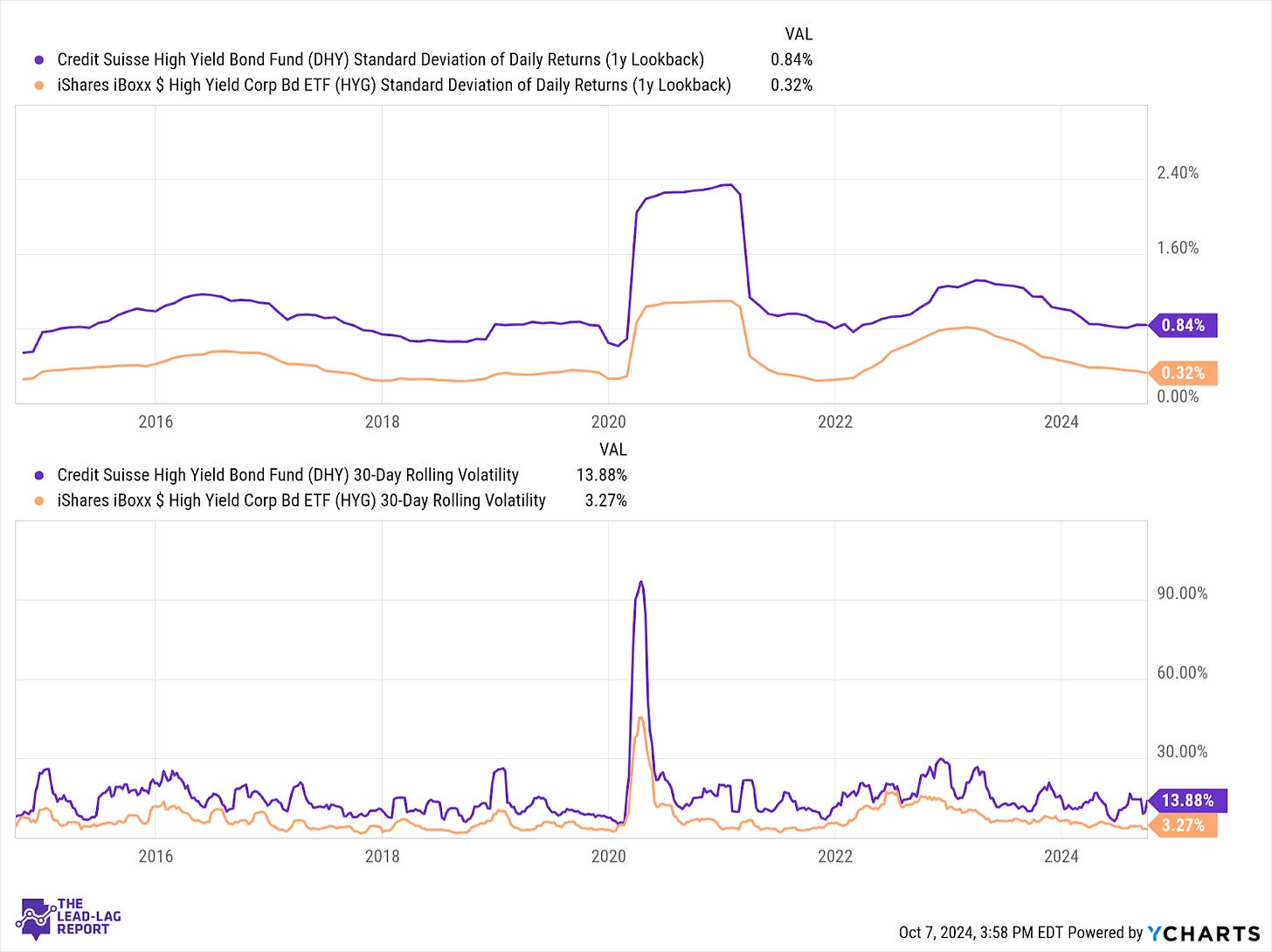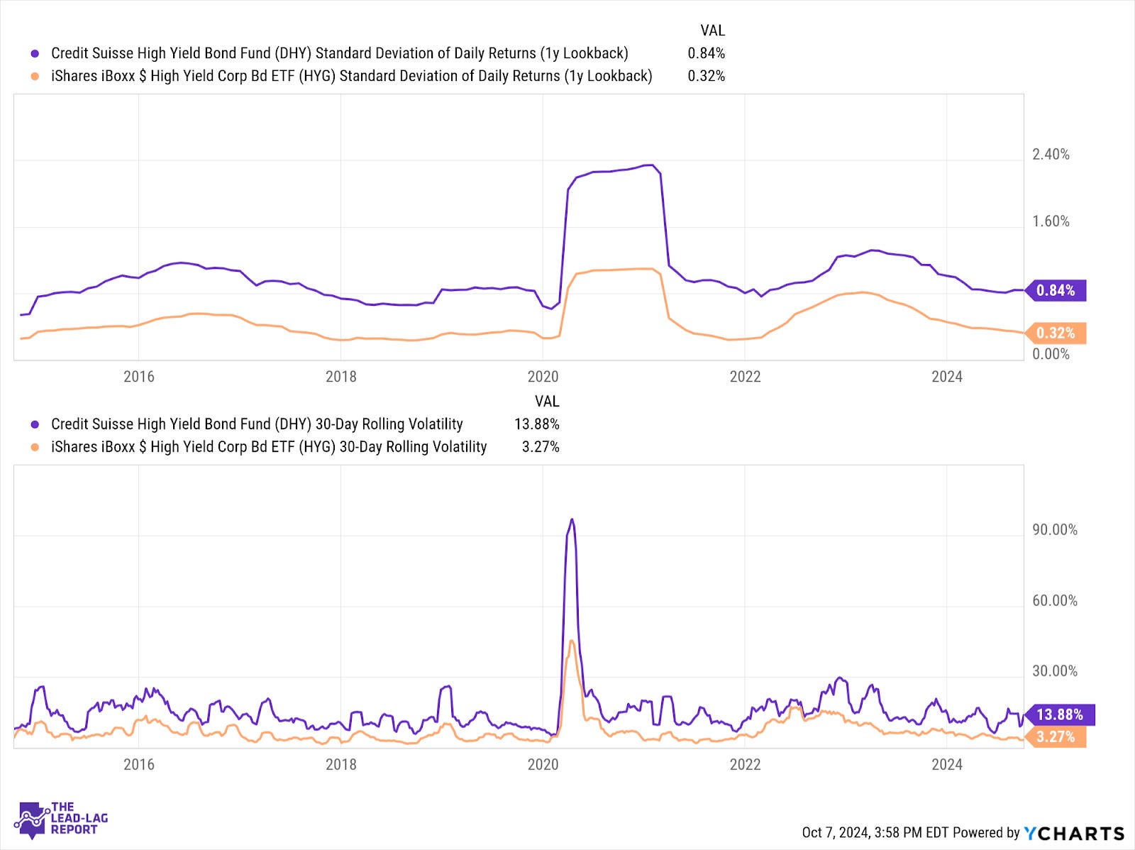 I point out that the fund’s absolute returns have been reasonable, but the risk-adjusted returns have been less so. DHY has managed to outperform the iShares iBoxx $ High Yield Corporate Bond ETF (HYG) since the latter’s inception, but risk-adjusted returns are actually trailing. Outside of the COVID pandemic period, conditions have mostly been favorable for junk bonds for years. With spreads at historic lows, there’s a good chance that the next decade isn’t nearly as kind. I’m worried about a fund with triple the volatility level of the index under those kinds of conditions.