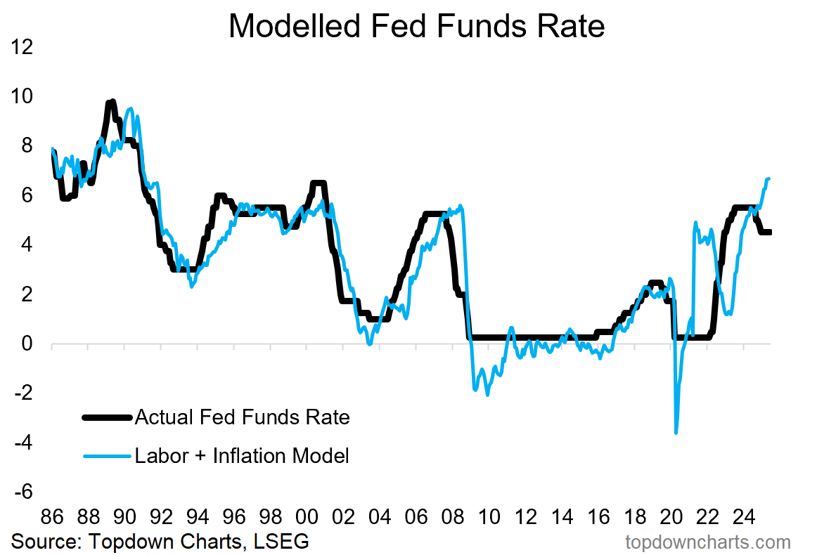 You can see that in 2025 the Fed Funds rate and the labor/inflation condition rate are diverging. The latter is rising while the former is trending down. History would suggest (discounting the 2020-2022 period for a moment since it was a once-in-a-generation event) that one of the two will reverse. Maybe not quickly, but history says that it eventually happens.