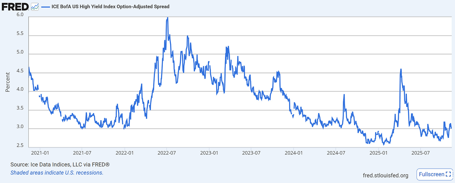 If Fed policy feels loose, the credit markets agree. Corporate debt is easier and cheaper to borrow than at almost any time in recent memory. Investment-grade bonds yield very little more than Treasuries today.¹ Even speculative-grade (“junk”) spreads are hovering near record lows. This tells us that investors broadly feel good about the economy. But that cheerfulness can be a warning sign. When spreads are vanishingly small, it often means investors are underestimating risk. A whiff of trouble – a sudden slowdown, a big debt default, or global shock – can quickly reverse those trends. Right now, the data on credit suggest an overheat, not a downturn. In plain terms, excess credit appetite is flooding the system with liquidity.