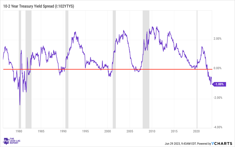Most of you already know about the predictive power of the 10-year/2-year Treasury yield spread. It’s been quoted often and says that when this spread turns negative, a recession is likely to occur within the next 12-24 months. This has happened leading every recession over the past half century.
