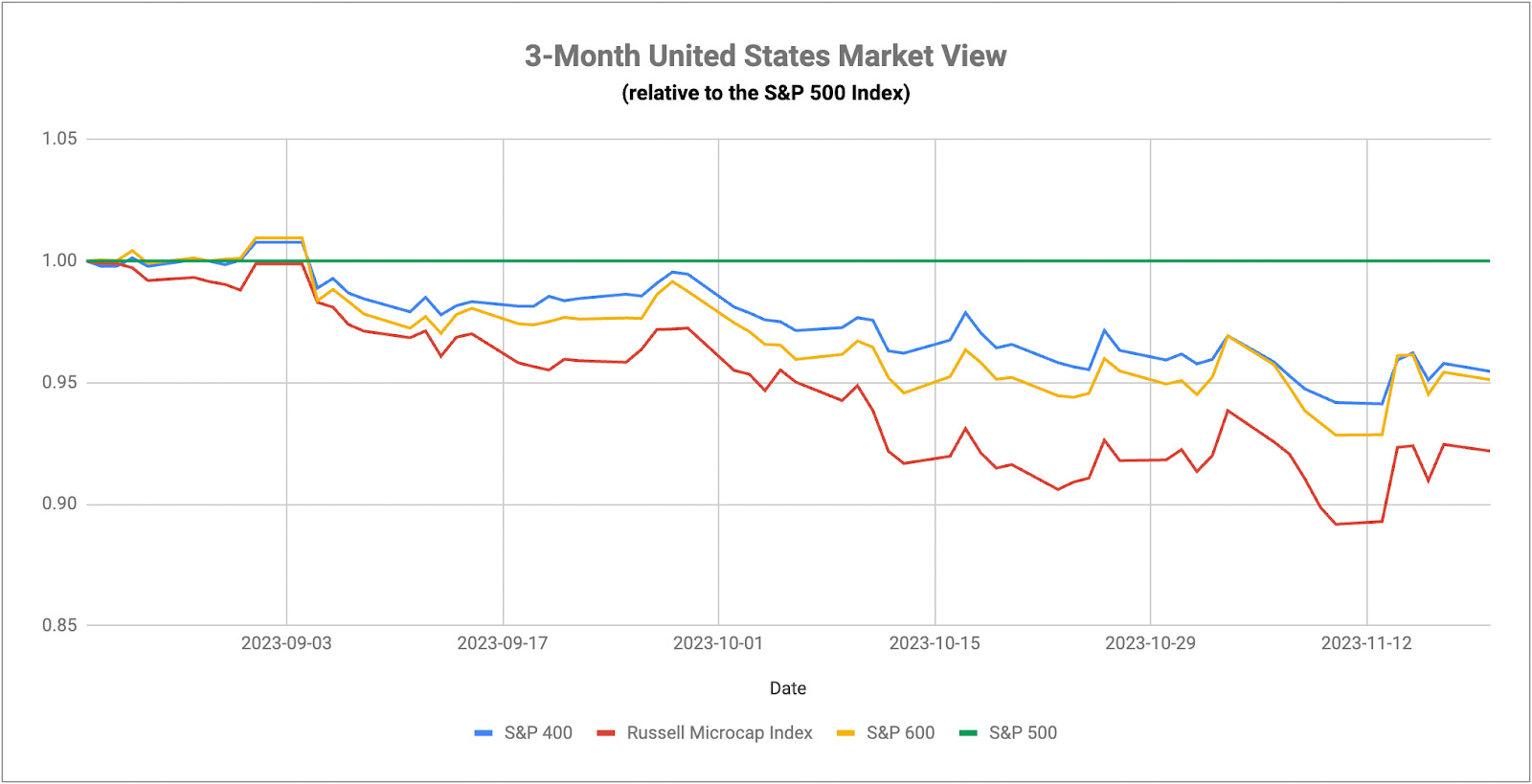 Volatility has become incredibly subdued again with the VIX approaching its lowest levels of 2023. With high yield spreads also retreating to some of their lowest levels of the year, it’s created a short-term environment conducive to risk-taking. Overall, we’ve seen small-caps and micro-caps trying to lead in fits and starts, but nothing that would suggest we’re entering a long-term risk-on regime at the moment. The one consistent feature we’ve seen throughout November is investors returning to the comfort of mega-caps and tech stocks even as conditions continue to evolve. That type of behavior isn’t necessarily unusual around this time of year, but it also doesn’t indicate a market that is broadly gaining across the board. Small-caps and value stocks are still trailing large-caps by about 17% year-to-date and we need to see those two groups perform much better before we can have the conversation about a sustainable equity market rally.