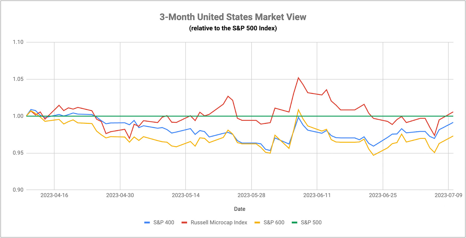 The next big domino to fall will be this week’s June inflation reading. The overall disinflationary is continuing, pulling the headline rate all the way down to 3% and the core rate to 4.8%, the lowest it’s been in more than a year and a half. A big part of the decline is due to a high base effect rolling off the 12-month measurement period. After this, the inflation rate is likely to begin moving modestly higher again. The core inflation rate is likely to keep hovering around the 4-5% range, which won’t be nearly low enough to get the Fed thinking about pausing. While the current environment is in a much better place versus when inflation was around 9%, we’re probably looking at 2025 before inflation gets close to a sustainable 2% rate. The markets have pretty much priced in an additional 1-2 more rate hikes and I don’t think anything we see on the inflation front this week will change that, but it is having the effect of lifting stock prices and dropping yields. This could help the markets maintain the current low volatility, general optimism mood through most of the summer.