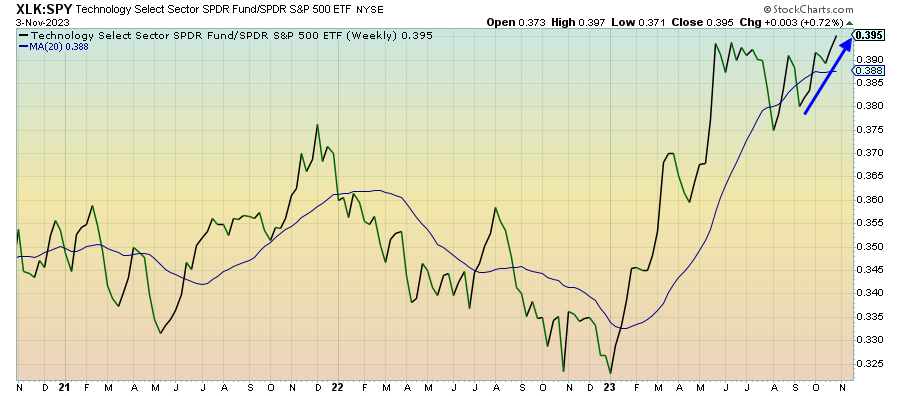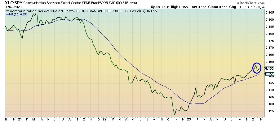 Even after the Q3 earnings season disappointment from the sector’s two heavyweight names, this sector is still on a fairly durable and steady uptrend. Given how deeply the sector underperformed from late 2021 to the end of 2022, it’s tough to say that there isn’t room for further upside. It will, however, need to see some gains beyond just Facebook and Alphabet. The equal weight version of this index has deeply underperformed by more than 30% so far this year.