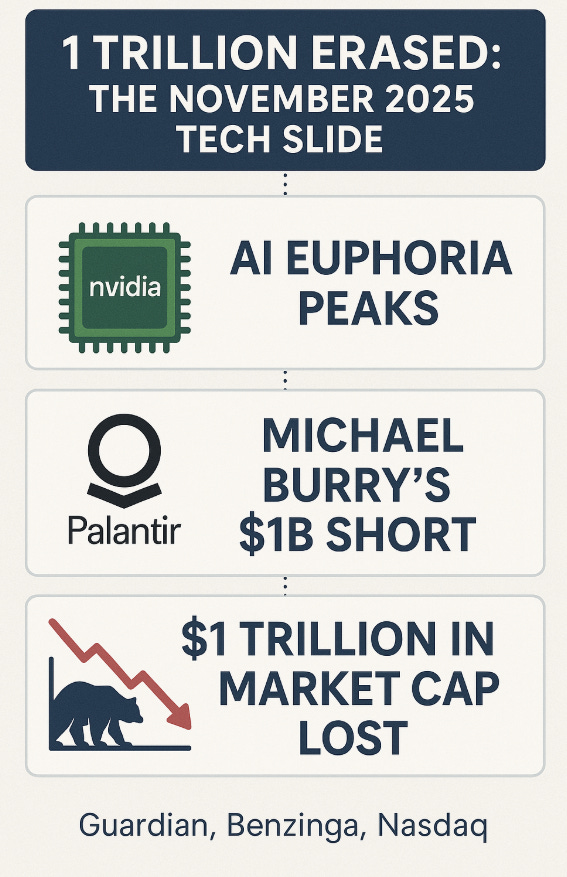 In early November 2025, markets stumbled after an extraordinary tech rally. Global indexes slipped as investors questioned whether the artificial-intelligence (AI) boom had gone too far. Even the entire “Magnificent Seven” — Nvidia, Amazon, Apple, Microsoft, Tesla, Alphabet, and Meta — fell in a single session, with the Nasdaq down about 2 percent and the S&P 500 off 1 percent amid worries over “elevated valuations.”¹ Palantir plunged nearly 8 percent despite a strong earnings report, and Nvidia gave back a chunk of its gains.² Warnings from JPMorgan’s Jamie Dimon and others that markets were “priced for perfection” suddenly appeared prescient.³