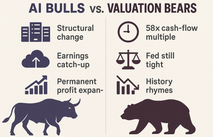 Strategists split on the meaning. Some called it a “speed bump, not a wall,”² arguing that profit-taking after a blistering rally was normal. Others warned that multiples above 50× free cash flow left little margin for error — when valuations soar that high, “time itself becomes the biggest risk.”¹²