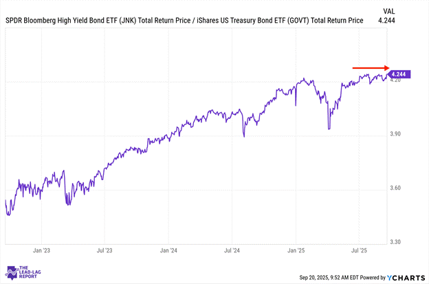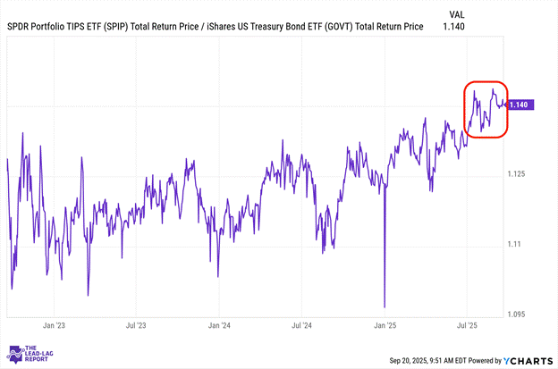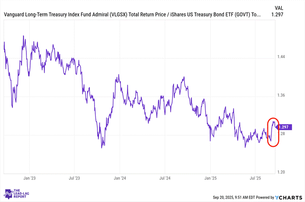 Long-duration bonds have experienced volatility as investors reassess long-term inflation expectations and terminal rate projections. Duration risk remains a key consideration for fixed-income allocations with institutional investors carefully managing their exposure. Last week’s Fed rate cut briefly pushed this ratio to a multi-month high.