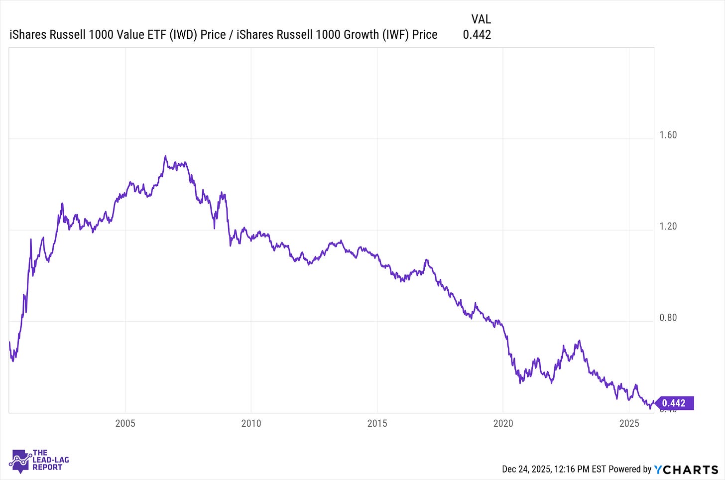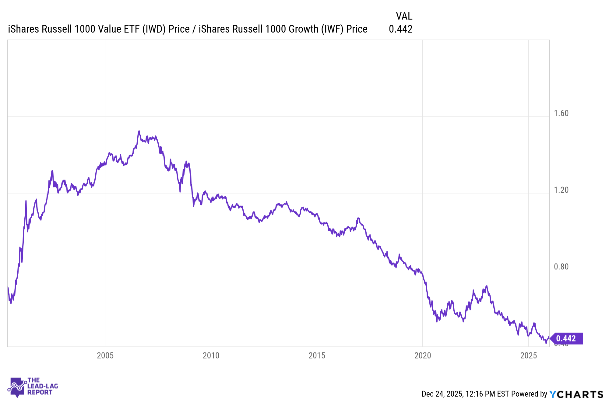 Value stocks, by contrast, spent much of this period on the sidelines. Traditional value sectors such as financials, industrials, and energy struggled with slower growth, regulatory pressure, and shifting investor preferences. As a result, value lagged growth for most of the past two decades, reinforcing the perception that its style was structurally disadvantaged.²