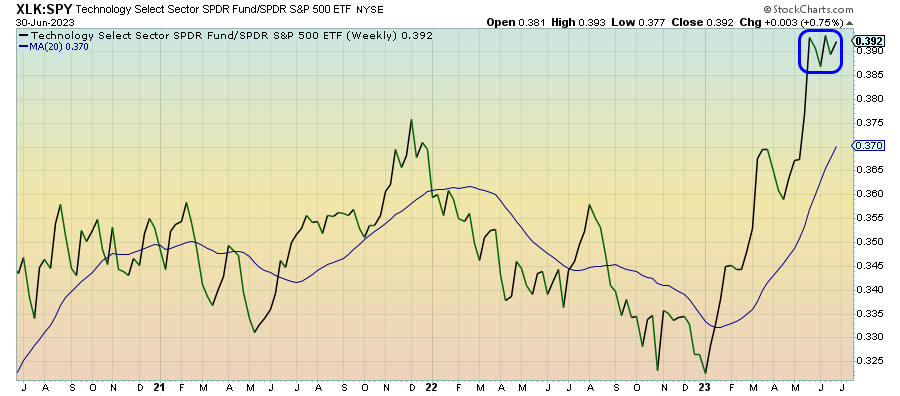 With the choppy pattern of this chart and long-term Treasuries finally starting to gain a little ground, we could be at or near the peak of this year’s tech rally. This sector is certainly short-term overbought, but this year has been all about sentiment and momentum in the equity markets. Since 2023’s gains have been so narrowly focused, the inevitable breather from this rally could be steeper than usual.