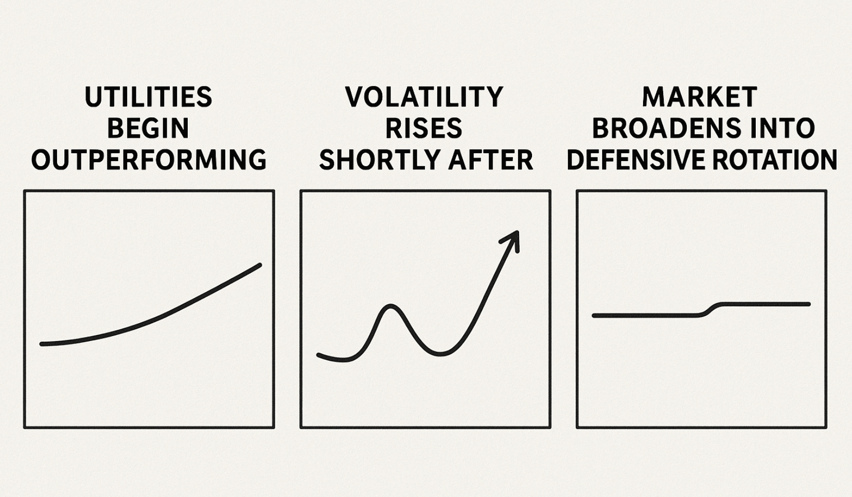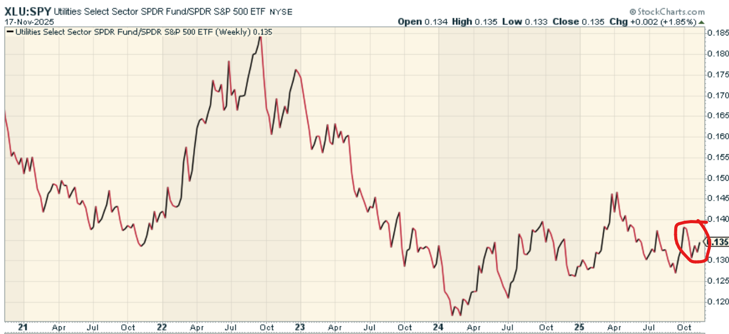 Utilities’ relative strength remains among the most reliable early indicators of changing market regimes. When investors grow uneasy, they tend to move toward essential services like electricity and water. When confidence is strong, cyclicals and growth stocks have the advantage. Because of this dynamic, utilities often outperform ahead of volatility spikes or equity pullbacks.