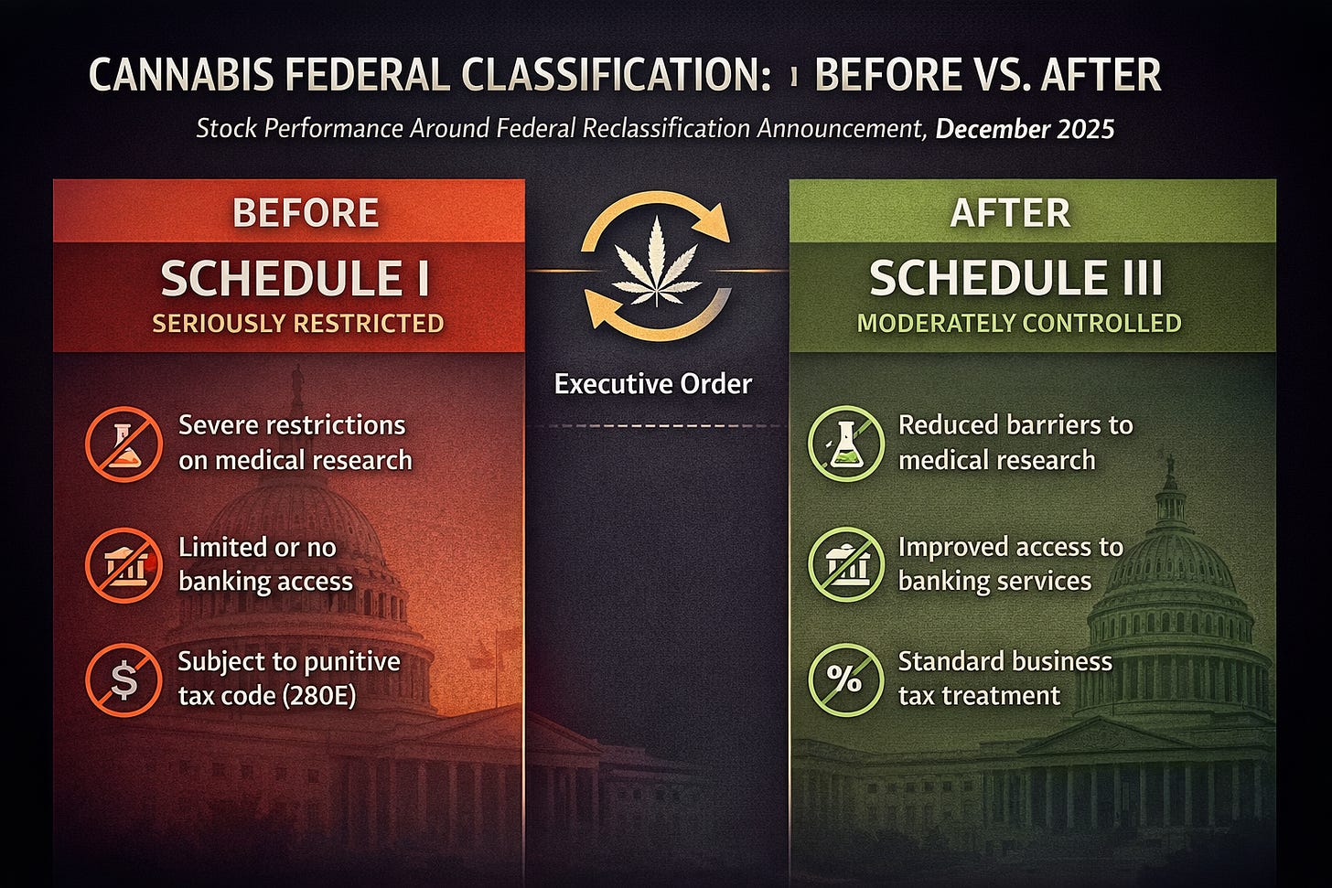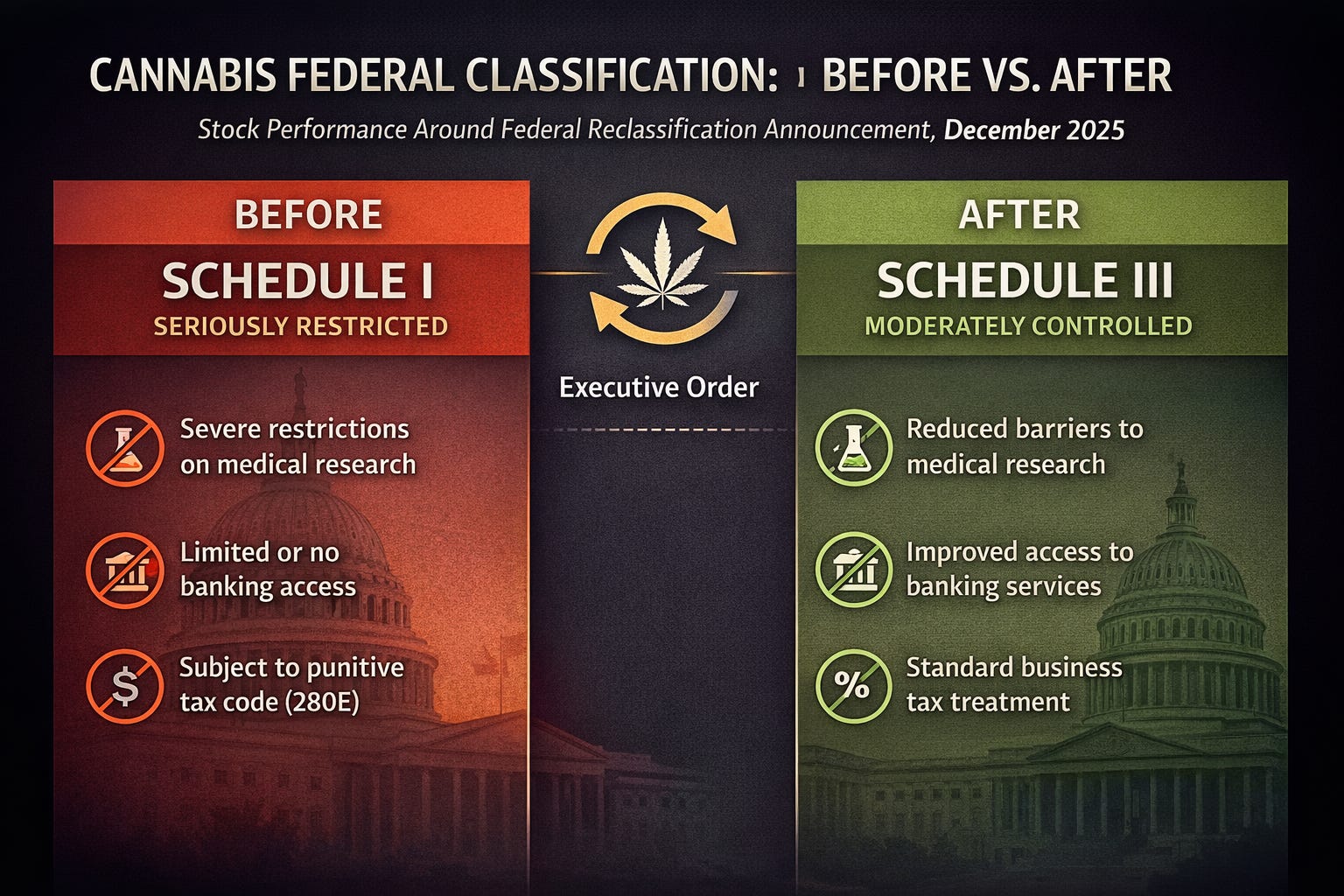 The broader significance lay in what the order suggested politically. Federal cannabis reform has historically been uncertain and often stalled by partisan divisions. The decision to act through executive authority signaled that policy momentum may be shifting more decisively than many investors had expected. That perception alone was enough to reset expectations across the market.