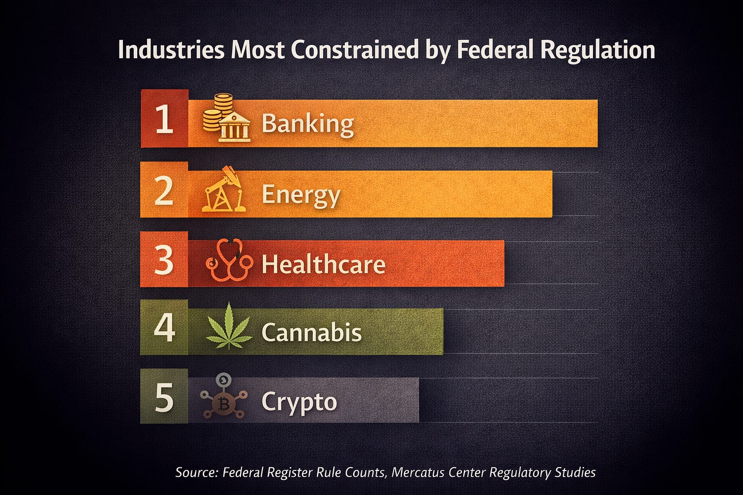The Free Markets ETF was launched with a clear organizing principle: identify companies that stand to benefit as regulatory burdens ease across the economy.⁷ Unlike sector-specific funds, FMKT is structured around policy dynamics rather than traditional industry classifications. Its portfolio spans financial services, energy, healthcare, and other areas where compliance costs and regulatory oversight materially influence profitability.⁸