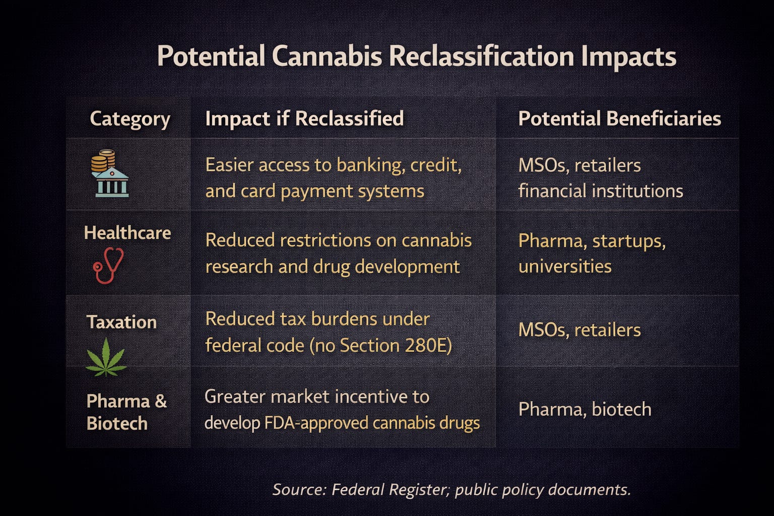 What unites these positions is the expectation that policy shifts can improve operating flexibility and economic returns. Cannabis reform fits naturally within that logic. The industry’s challenges have been rooted less in demand than in legal and financial constraints. Reducing those frictions could enable more efficient capital allocation, improved margins, and broader participation from institutional investors.