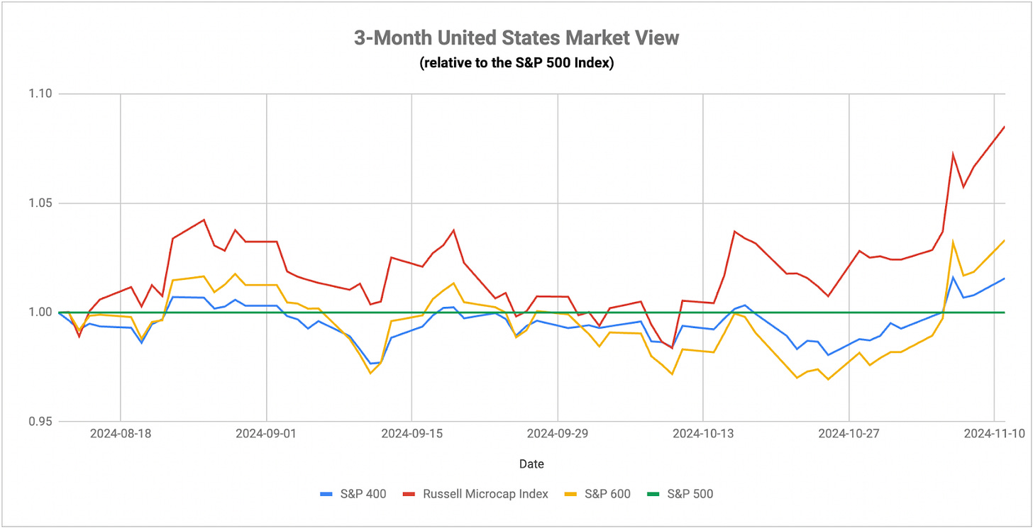 What’s interesting here is that if you look at the path of U.S. equity returns over the past week, there hasn’t been just a gentle drift towards small-caps over large-caps, it’s been an outright leap. That’s pretty evident looking at just the chart above, but it’s notable that the equal-weight S&P 500 has actually underperformed the traditional index even though small-caps have jumped into favor. I’ve been pounding the table for a while that small-caps not only could be one of the biggest beneficiaries of a Trump re-election, but may hold the key for the markets in general. The degree to which they’ve outperformed thus far and the strength of the move suggests that this rally could have some long-term legs. I’d expect some volatility during the transition period from one administration into the next, but buy-and-hold investors could be rewarded over the next several quarters and beyond.