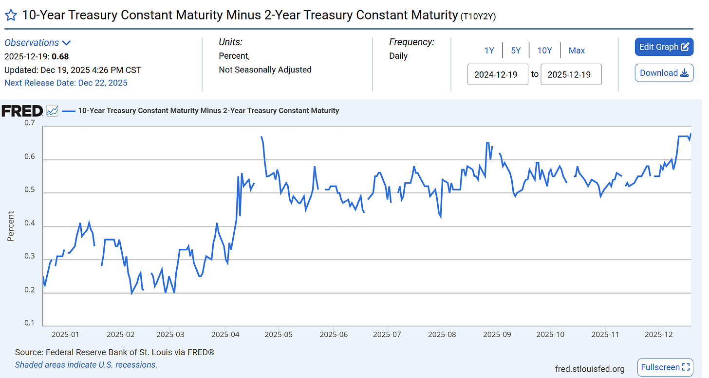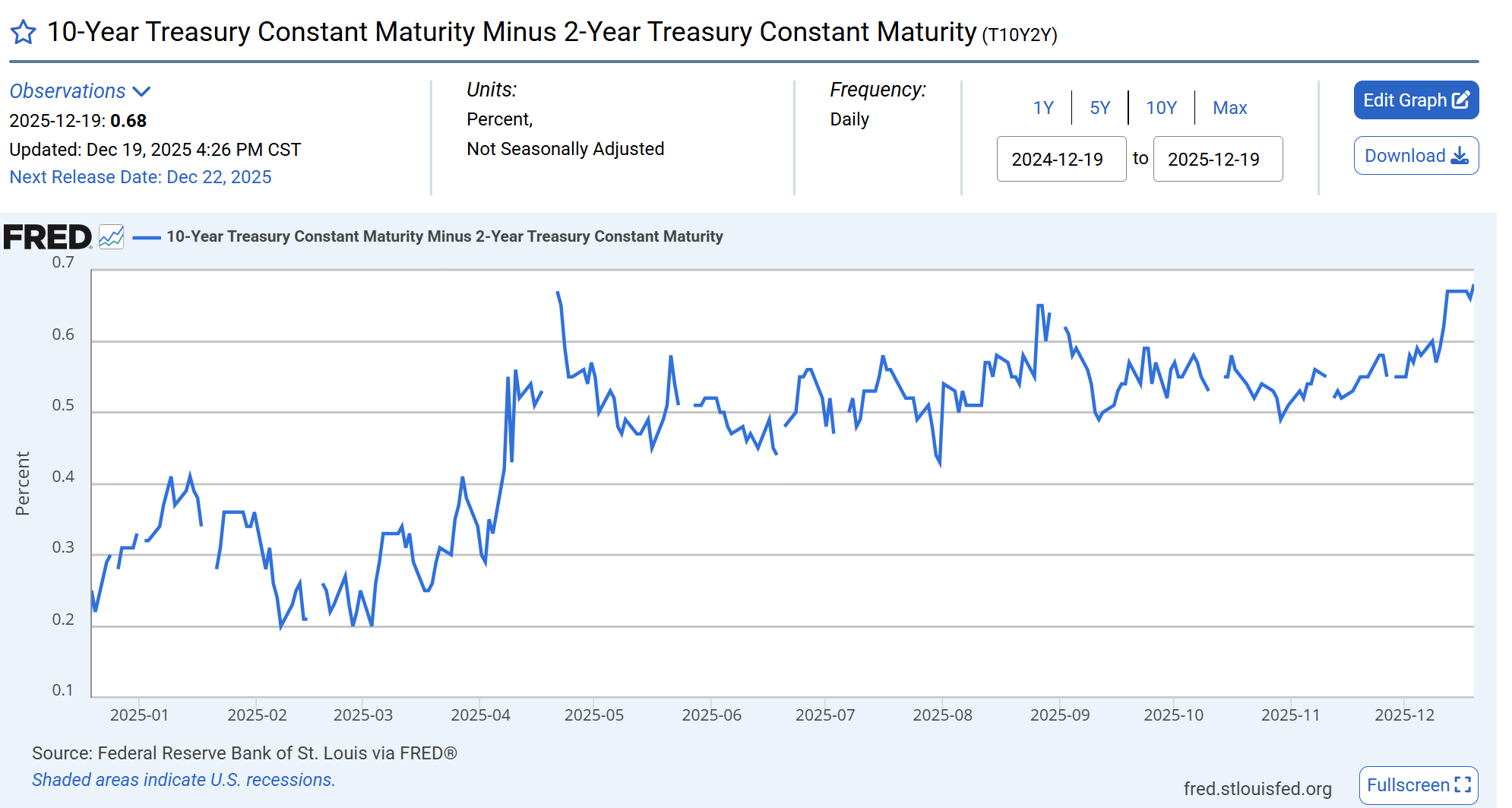 Bond markets reacted decisively. Treasury yields fell across the curve, and the long-running inversion finally reversed. The spread between 10-year and 2-year yields turned positive for the first time in over two years, reflecting expectations that policy is no longer restrictive enough to choke off growth.³ Equity markets absorbed the shift with relative calm. December trading proved choppy, but the S&P 500 still finished the year firmly higher, extending a multi-year run of strong performance.⁴