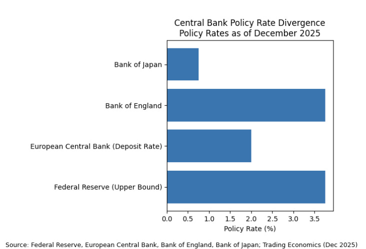 The final weeks of 2025 underscored how fragmented the global macro environment has become. While the Federal Reserve moved toward the sidelines after its latest rate cut, other major central banks pushed policy in different directions. Investors responded not by abandoning risk, but by shifting leadership within markets. As 2026 approaches, divergence—across monetary policy, regions, and asset classes—has replaced synchronization as the defining theme.